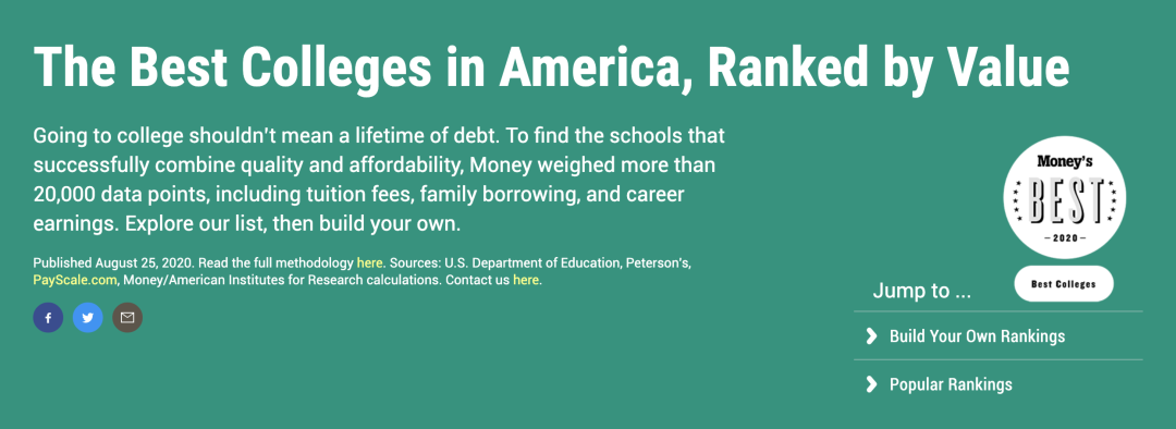 这样的疑惑是正常的。短期来看,在家上网课并没有让大学的学费降低,而之后,也不知道会有怎样的改变。这样大的不确定性,也催生了美国Money杂志的年度最具价值大学排名。
