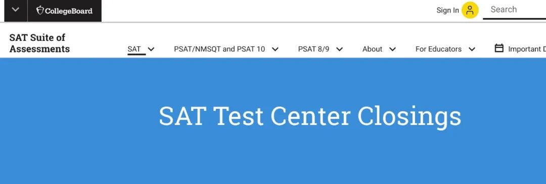 在College Board官网中,推出了专门的SAT Test Center Closings考场关闭搜索页面。