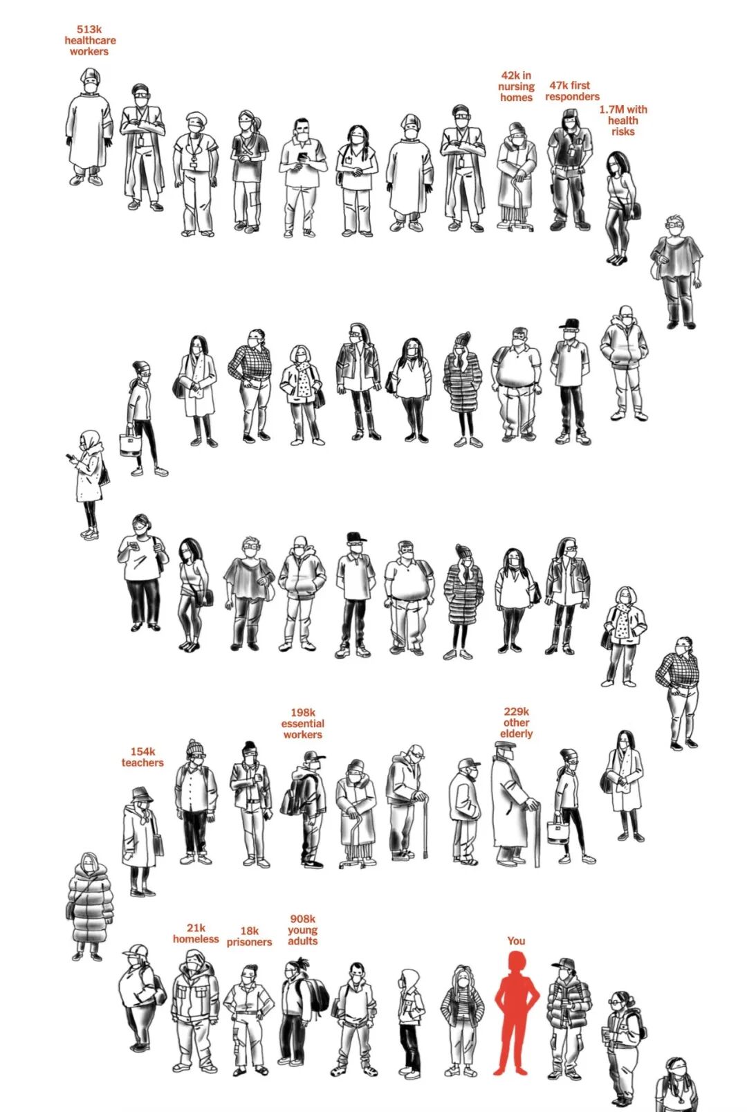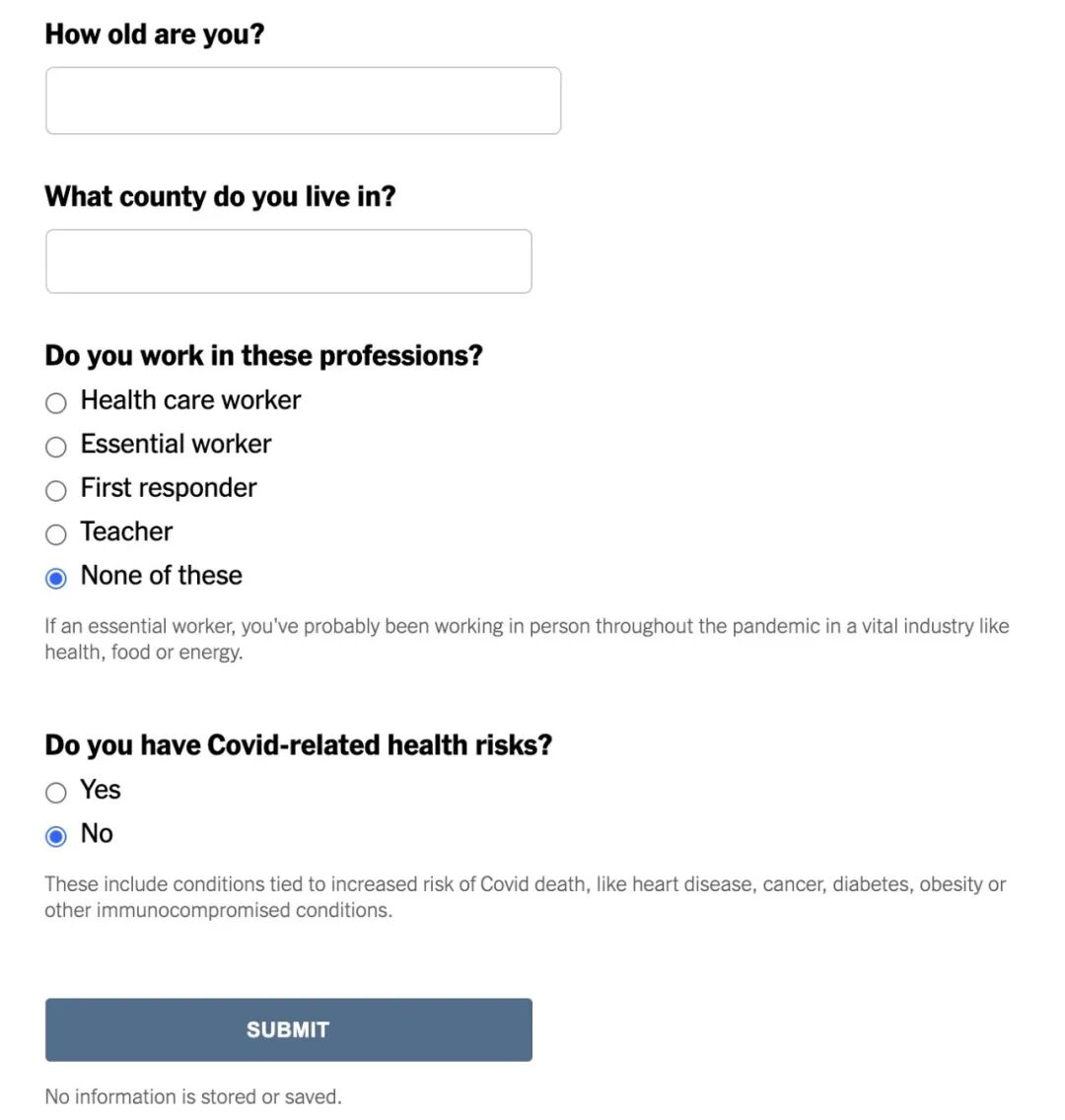 身处美国的大家,可以参考纽约时报最新的疫苗接种tracker,预估自己的接种时间。在填写自己的基本信息后,就可以大概知道自己在美国本地的疫苗接种排序。