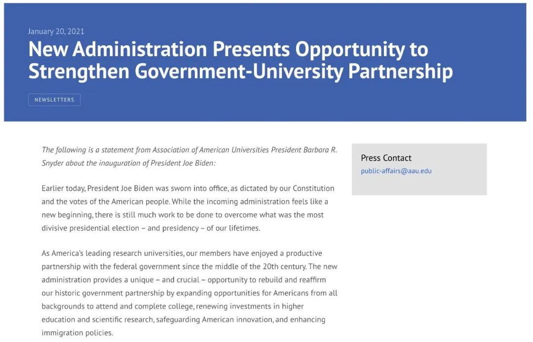 美国大学协会主席芭芭拉·R·斯奈德认为这一举措将有效加强政府与大学之间的合作。她在一份声明中提到:“我们感到高兴的是,拜登总统提出了一条让世界上最优秀和最聪明的人留下的道路,以留在美国完成研究生学习后继续为我们的国家做出贡献。”