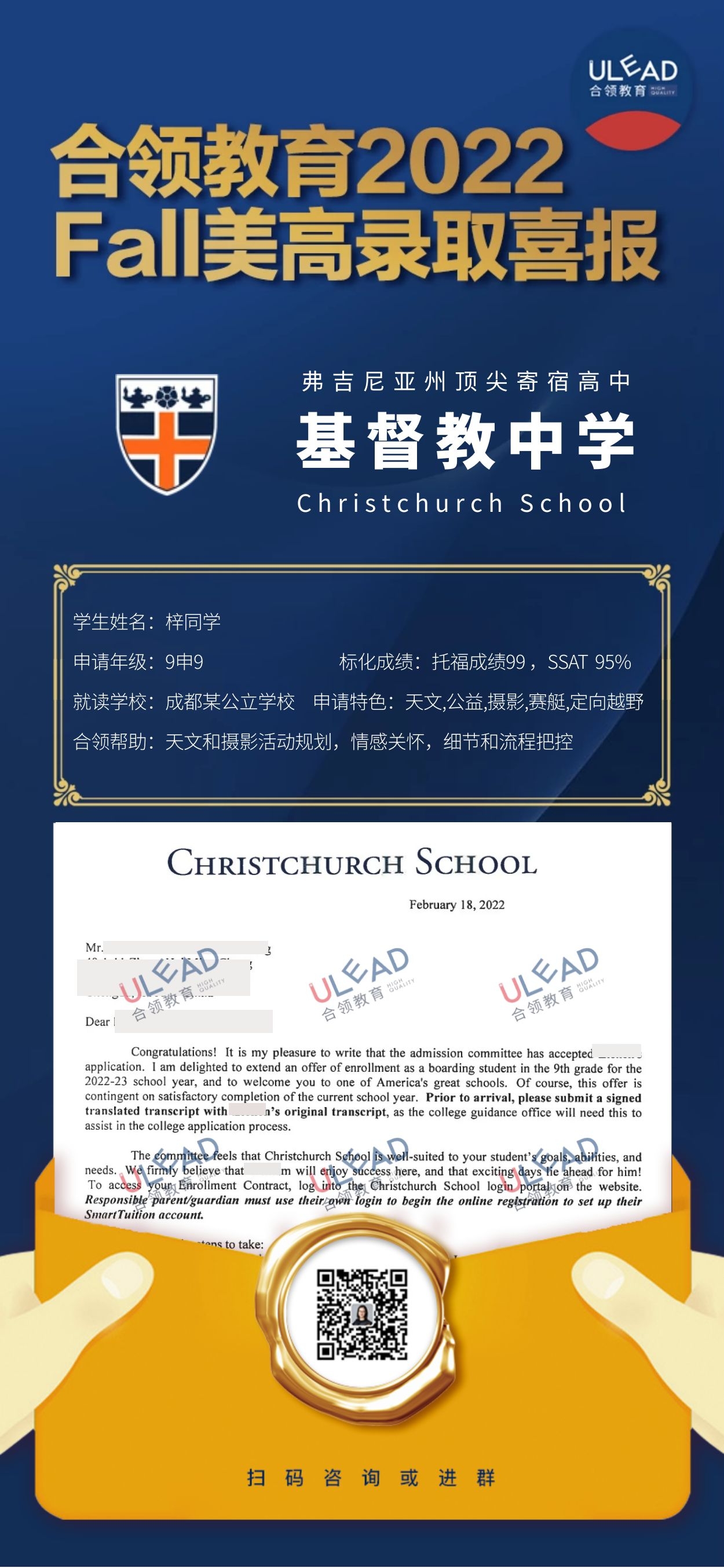 祝贺合领梓同学,收获弗吉尼亚顶尖寄宿美高Christchurch School录取offer!