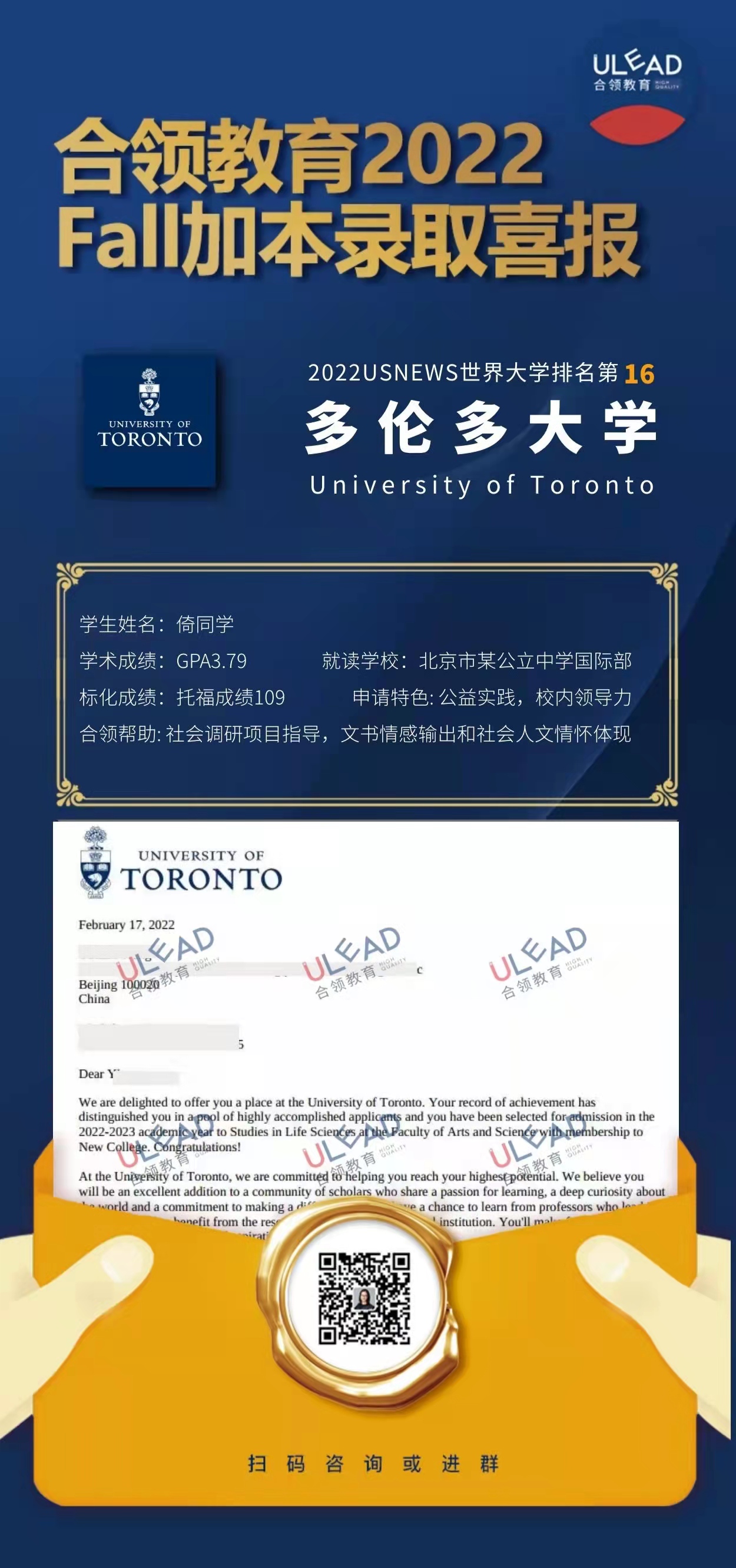 祝贺合领教育学员倚同学,获得多伦多大学录取offer!